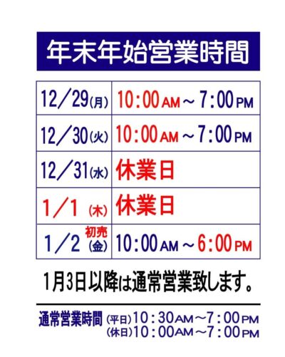 年末年始の休業日のご案内です。12月30日までは休まず営業いたします。